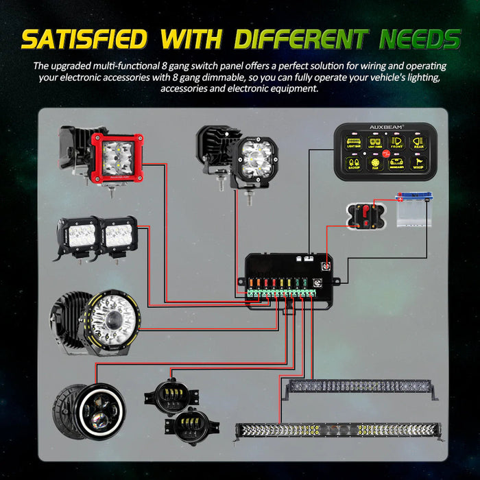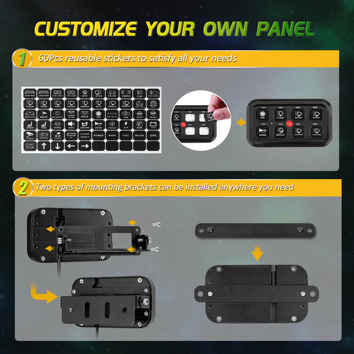 • 8-Gang one-sided outlet switch panel. It allows you to control up to 8 different LED lights or devices. Command all your vehicle accessories by the tap of your finger.