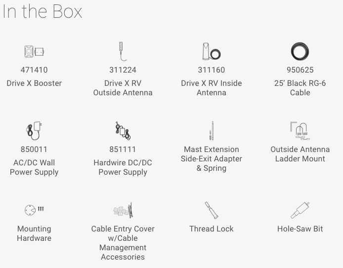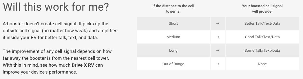 Drive X RV is our standard multi-user, in-vehicle cell signal booster for all classes of RV. It’s designed to reach cell towers at distances up to 33% farther than the weBoost Drive Sleek.